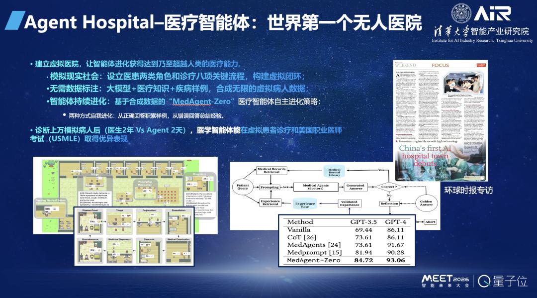 在这个虚拟世界里面,多智能体会互相交互和学习,然后持续快速地进化,这样就是能在很短的时间,比如说两天它就可以完成一个三甲医院两到三年的这些病例,而且准确度还要高得很多。