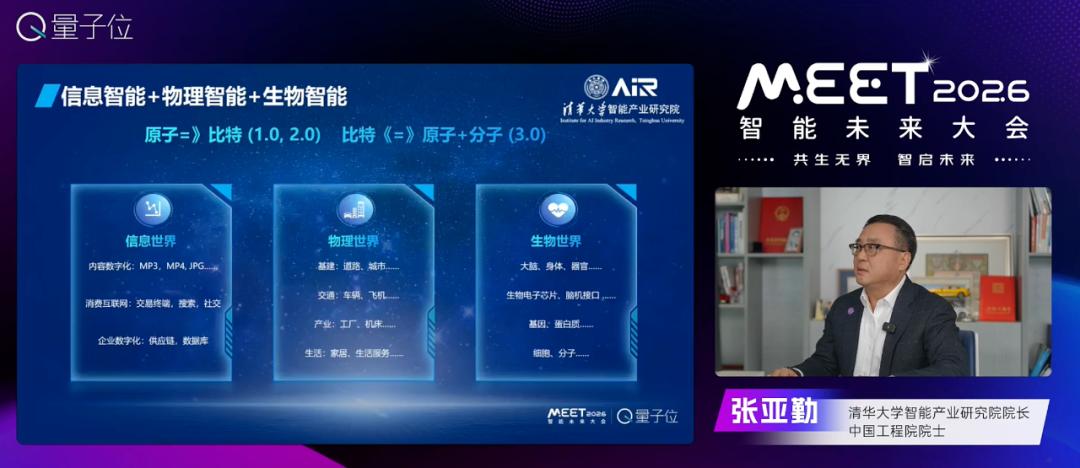 首先就是新一轮的人工智能,它是信息智能、物理智能和生物智能的融合,我们的信息世界、物理世界和生物世界都走向了数字化,所以它也是原子、分子和比特的融合。