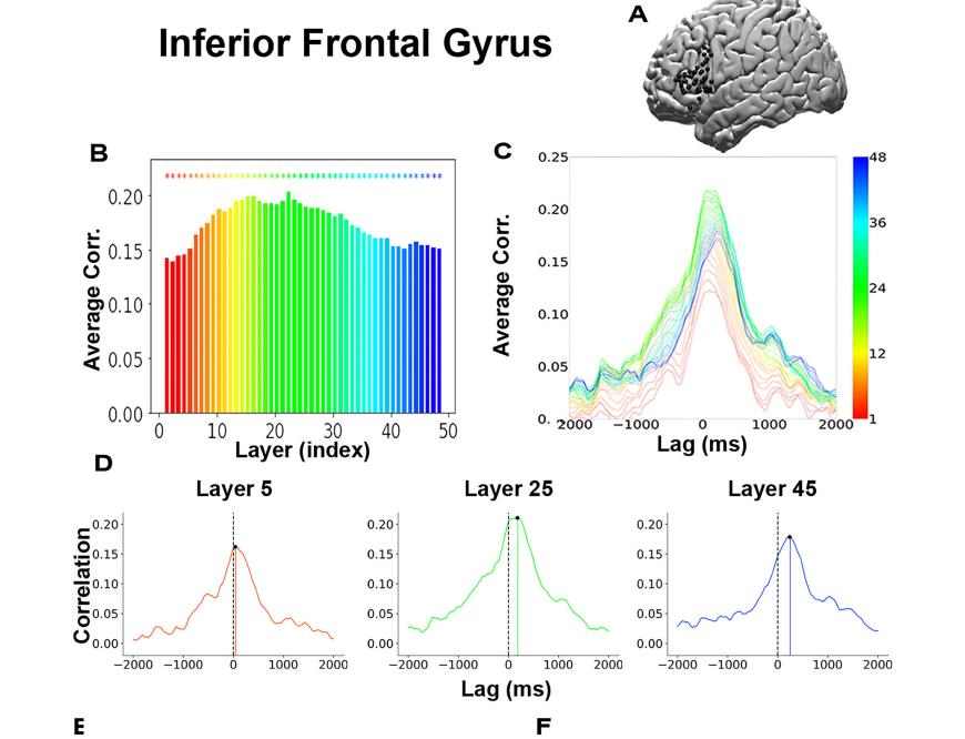 在关键语言区IFG内部,GPT的层级结构同样呈现强烈的时间对应关系。左:浅层至深层的相关度分布(暖色→冷色)。右:浅层峰值更早、深层更晚,形成规律性的时间推移。IFG 的整体拟合度达到r=.85(p < .001)。