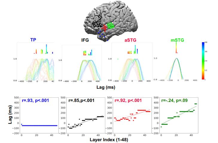 GPT的48层在大脑语言通路中呈现出清晰的「时间—深度」对应结构。浅层(暖色)在更早的时间点达到峰值,深层(冷色)在更晚时间出现。TP、aSTG、IFG等高阶区域表现出强线性关系(r=.93 / .92 / .85),而mSTG(近听觉皮层)几乎没有层级结构(r≈0)。