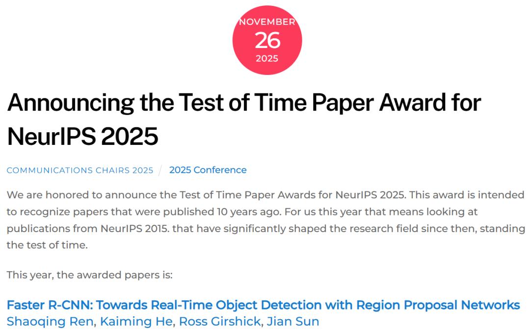有一项荣誉的颁发显得格外厚重且众望所归 —— 由任少卿、何恺明、Ross Girshick 和孙剑合著的经典论文 《Faster R-CNN》,摘得了 「时间检验奖」 (Test of Time Award)。