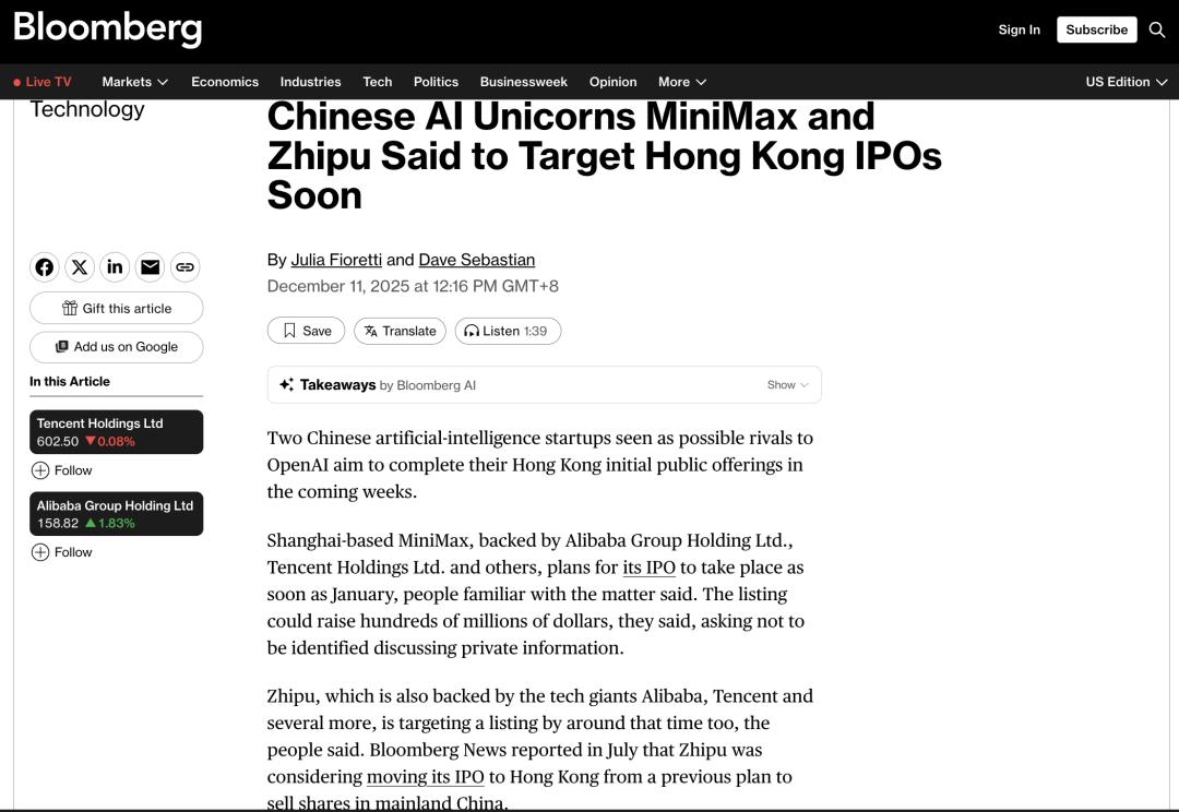 彭博社的报道提供了更多细节,MiniMax最快可能在明年1月上市,募资数亿美元;智谱AI也瞄准相近时间点,此前曾考虑内地上市计划已转为港股。