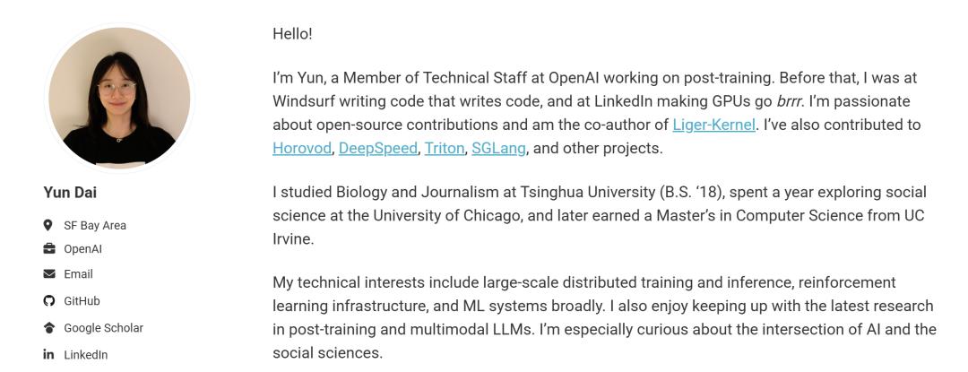 负责后训练的Yun Dai,本科来自清华大学,在加州大学尔湾分校获得了计算机科学硕士学位。