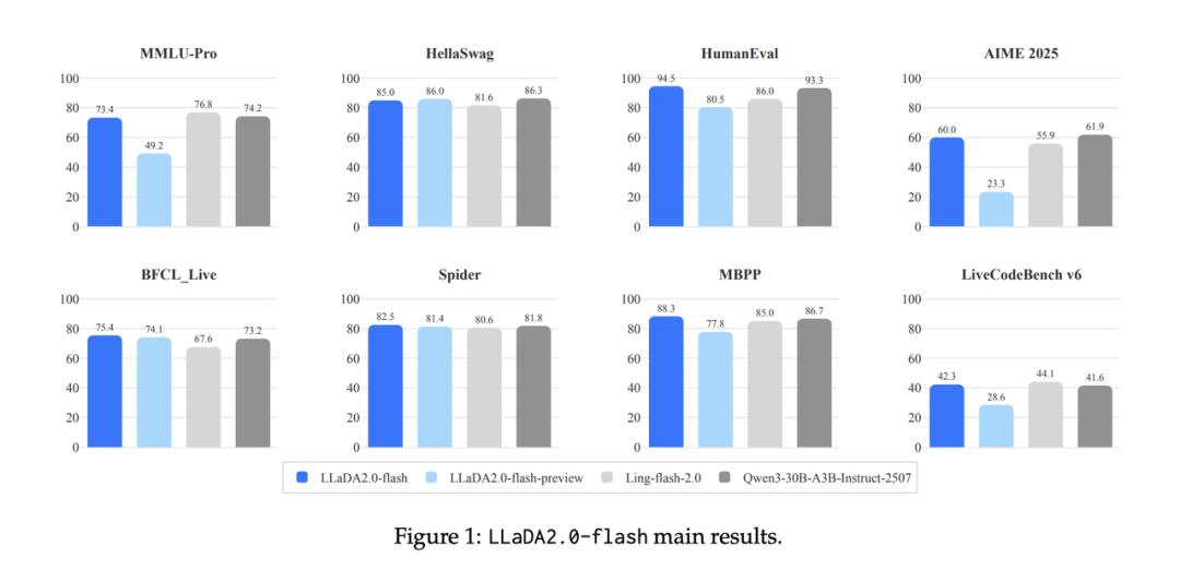 更令人欣慰的是,模型变大了,也确实变强了:在涵盖知识、推理、编码、数学、智能体与对齐几大维度的 47 个基准测试中,LLaDA2.0-flash 平均得分 73.18,与强 AR(自回归)模型 Qwen3-30B-A3B-Instruct-2507(73.60)持平,在编码(如 HumanEval、MBPP)、智能体(BFCL)等复杂任务上优势显著。