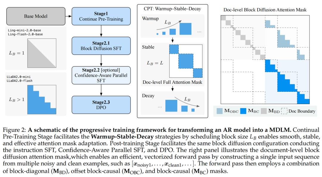 其中在 Warmup(热身)阶段,团队将 Ling-mini-2.0(16B)等 AR 基座模型视为块大小 = 1 的块扩散语言模型(BDLM)起点,并按照「1→4→32 → 64 → 4096」逐步增加块大小。块大小的每次调整在中等规模数据上进行训练,以确保模型平稳过渡。在块大小达到最大 4096 时,BDLM 转化为标准的掩码扩散语言模型(MDLM),完成从因果生成向全局双向去噪的结构性迁移。