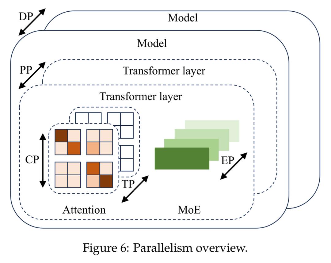 在预训练阶段,团队将 Megatron-LM 用作训练后端,并结合数据并行(DP)、流水线并行(PP)、张量并行(TP)、上下文并行(CP)与专家并行(EP)的多并行策略,使得千亿级模型在长序列与复杂注意力结构下仍能保持高吞吐与强扩展性。