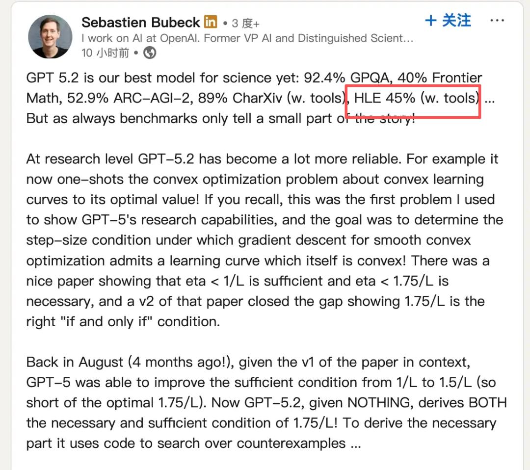 在领英上的发文,在这篇发文中,Sebastien Bubeck 称 GPT-5.2 在人类的最后考试(HLE)中的得分是 45%,而谷歌这款新的 Agent 的得分是 46.4%,略高于 GPT-5.2。