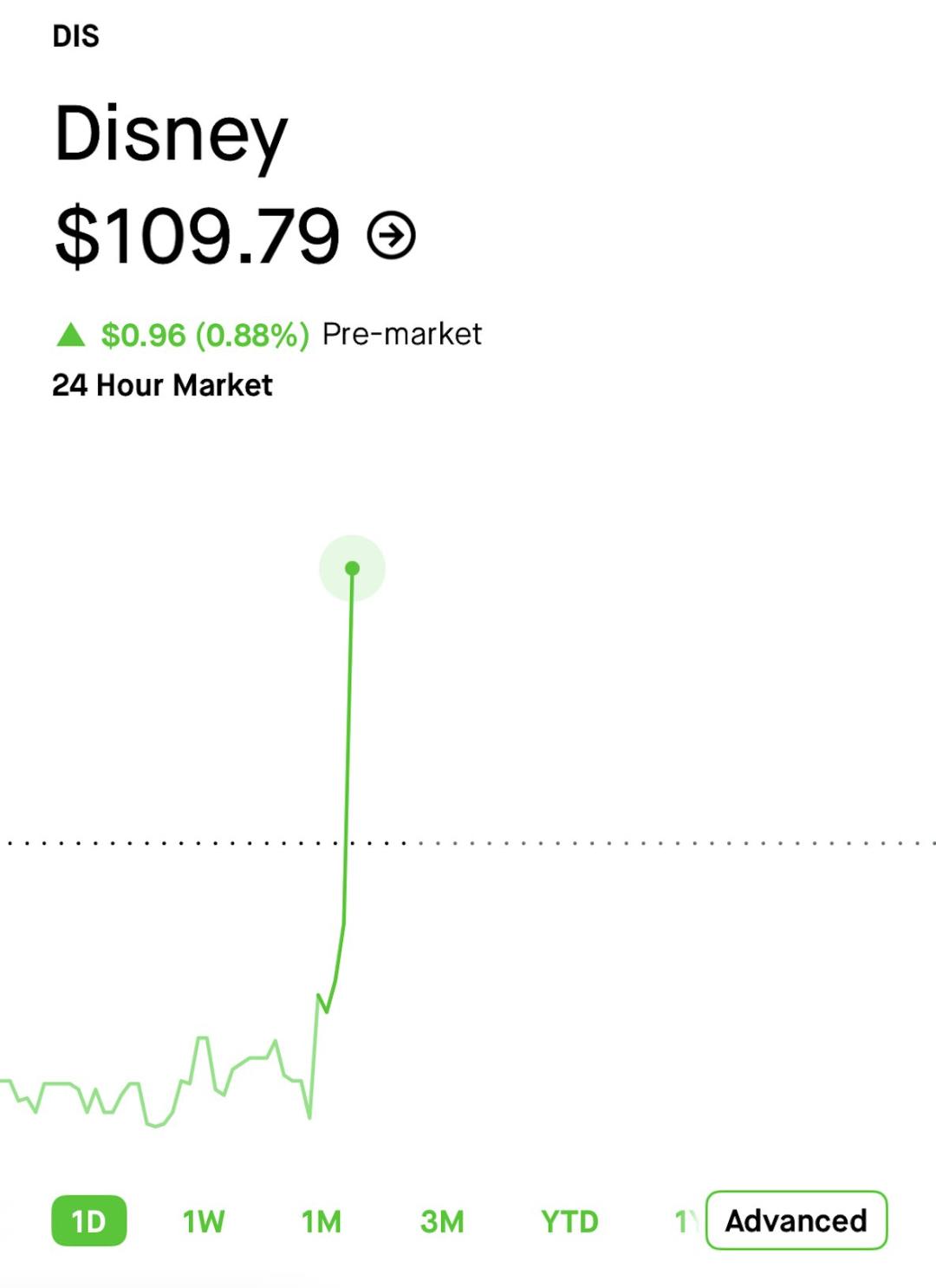 迪士尼股价在盘前明显拉升;股价在涨,不是因为大家觉得内容会更好,而是因为迪士尼终于顺着 AI 的水流游了。