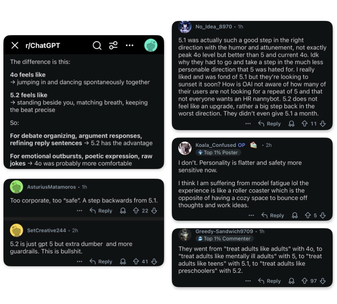 另一些网友反馈说,GPT-5.2似乎把成年人当学龄前儿童对待,感觉不像是升级,反而是倒退。