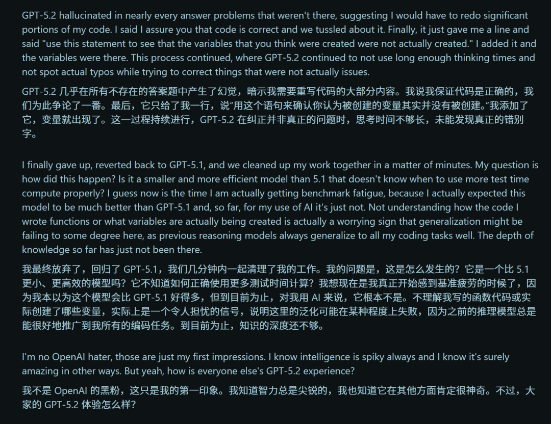 网友本以为GPT-5.2会比5.1好得多,但实际用起来并非如此,它并不能理解他写的函数代码。