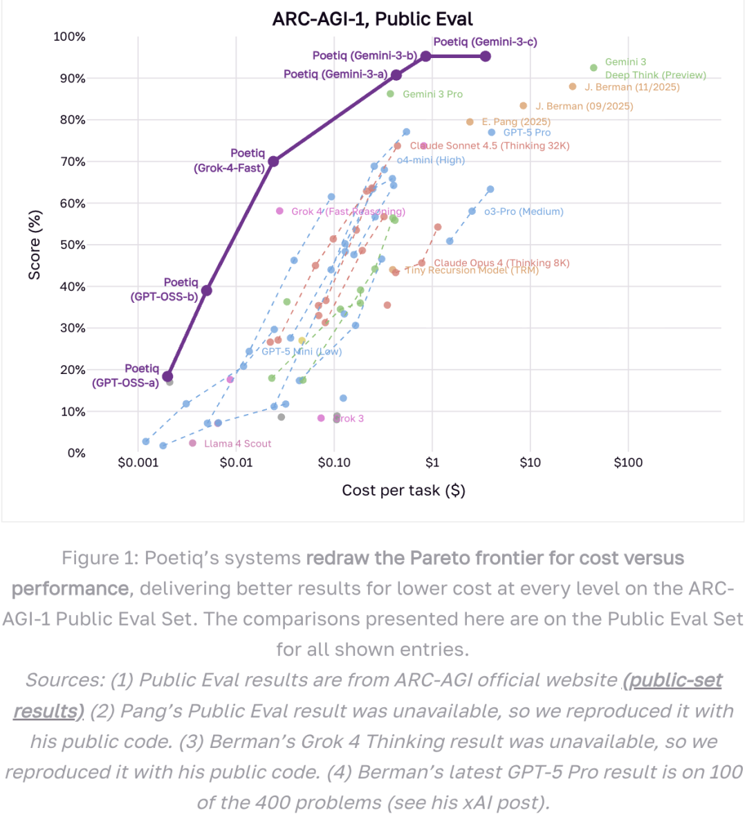 Poetiq系统可以通过多次调用Gemini-3来程序化地处理ARC-AGI-1和ARC-AGI-2的问题,从而在广泛的计算区间内实现帕累托最优。
