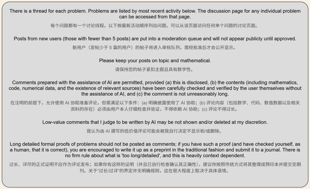 另一个关键因素是Erdős问题网站上「平衡的AI政策」,它鼓励公开说明AI的使用情况,同时强烈反对隐瞒使用——