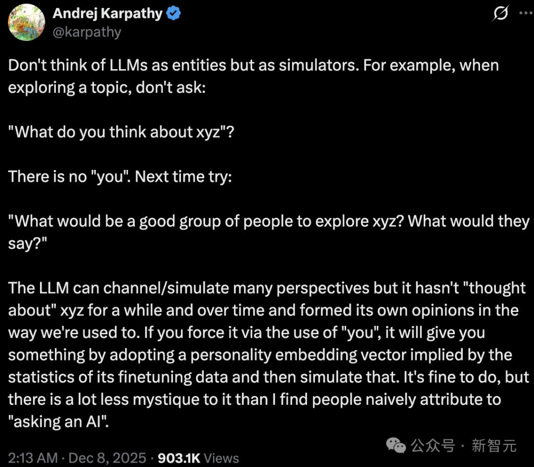 Karpathy的这种解释,在一定程度上破除了大家想象中「在向一个AI发问」时所带来的那种神秘感。