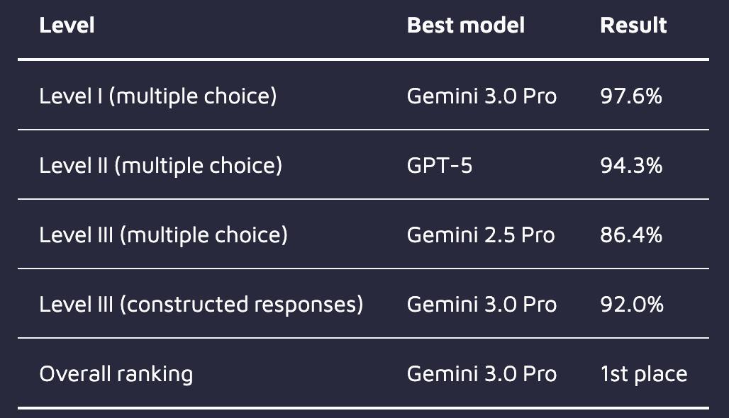 来到侧重应用与分析(案例研究)的二级考试,GPT-5反超夺魁,准确率达94.3%。Gemini 3.0 Pro和Gemini 2.5 Pro分别以93.2%和92.6%紧随其后。