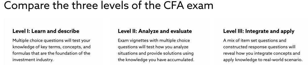 全部三级考试,需要逐级通过,涵盖从基础知识到应用分析、直至复杂投资组合构建的进阶能力。