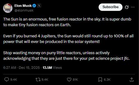 15日,埃隆·马斯克在社交平台X上公开唱衰核聚变发电。其直言不讳道:“在地球上建造小型核聚变反应堆简直愚蠢至极。”