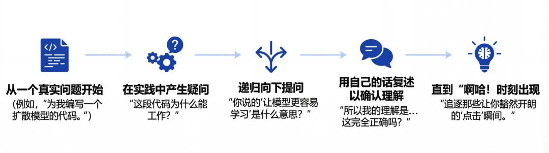 我觉得 Gabriel 的方法论可以抽象成一个更通用的五步框架,每个人都可以通过 AI 学习任何不懂的领域。