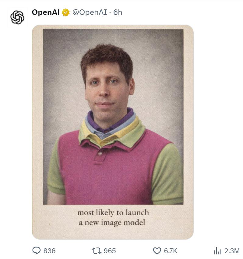 实际上,山姆・奥特曼之所以发这样一张辣眼睛的图片,正是为 OpenAI 刚刚推出的全新ChatGPT Images造势。而且这也不是唯一一张基于奥特曼照片改的图。OpenAI 官方号还专门单独特地发了一张这样的:
