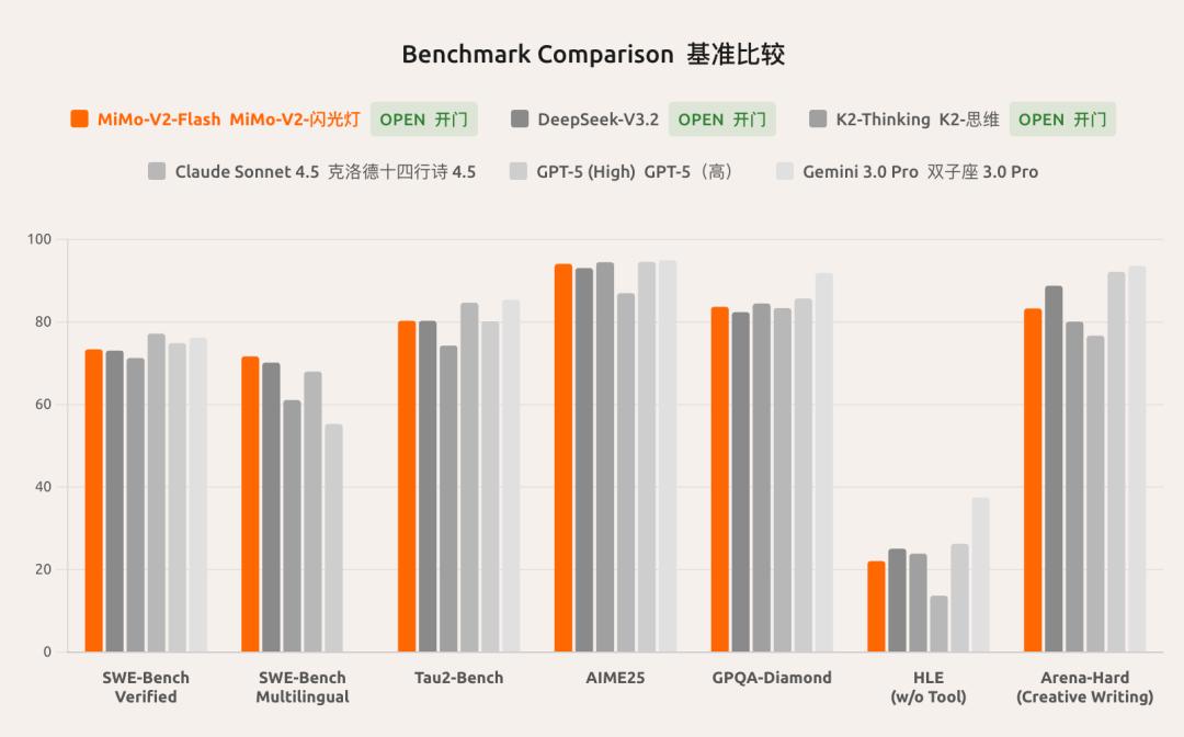 基准测试结果显示,MiMo-V2-Flash的性能基本与DeepSeek-V3.2相当,仅在不使用任何工具辅助的“人类最后一场考试”和创意文本生成评估ARENA-HARD中略逊色于DeepSeek-V3.2,但时延更小。