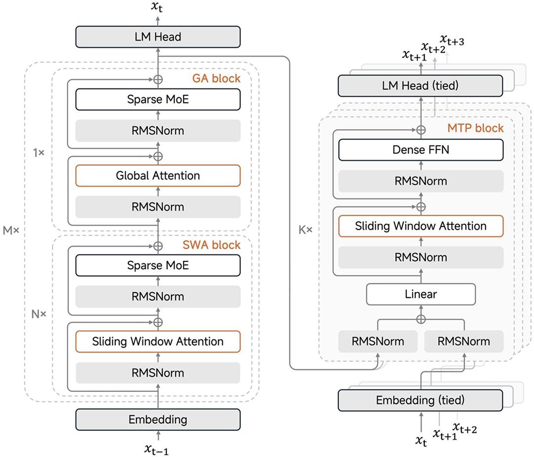 MiMo-V2-Flash利用MTP作为原生草稿模型进行自我推测解码,实现了实际部署加速。