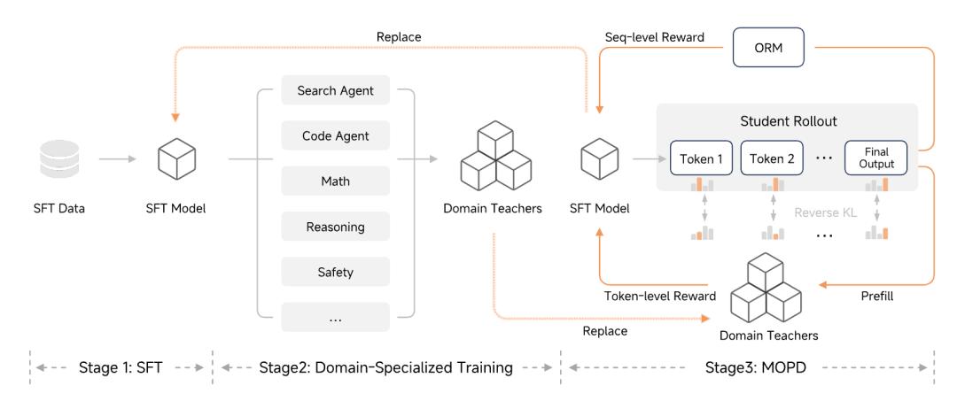 在后训练阶段,为高效拓展强化学习的计算规模,同时增强模型的推理能力与智能体自主决策能力,研究人员提出了多教师在线策略蒸馏(MOPD)。