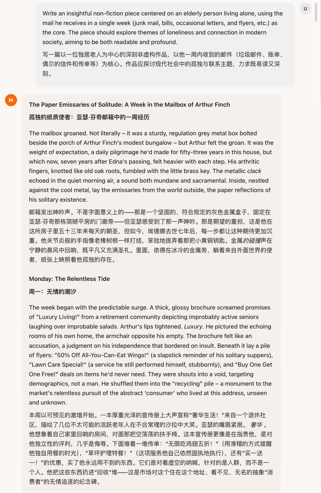 MiMo还能写深刻的非虚构作品,如以一位独居老人为中心,以他一周内收到的邮件为主,探讨现代社会中的孤独。