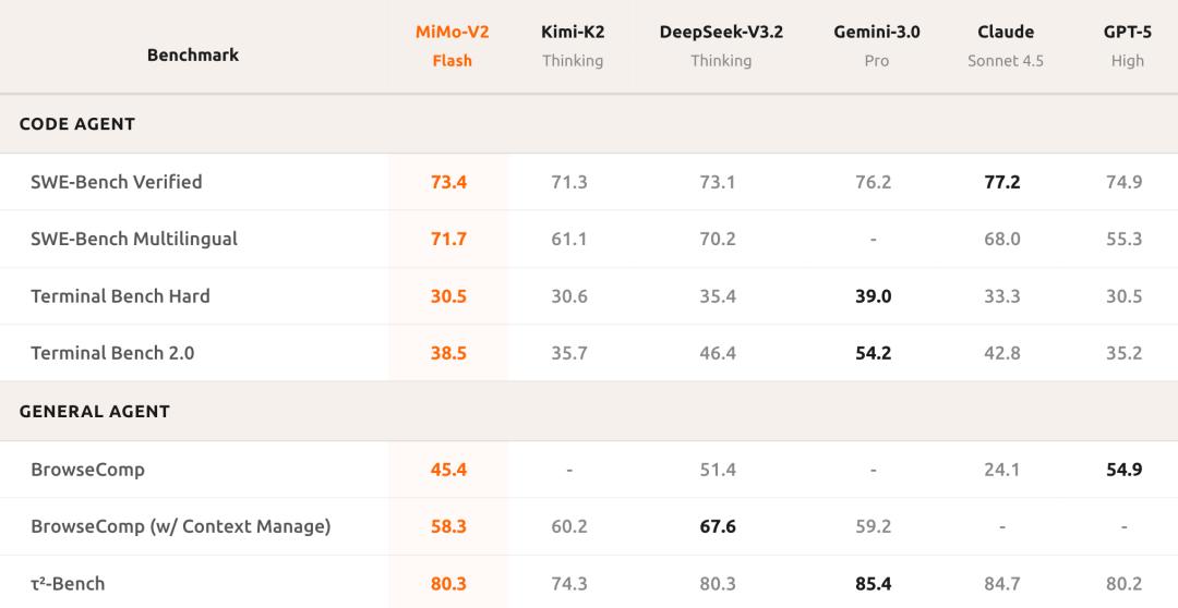 在Agent任务中,MiMo-V2-Flash在SWE-Bench Verified中超越所有开源竞争对手,性能接近 GPT-5-High。在SWE-Bench多语版本中,MiMo-V2-Flash解决了71.7%的问题。