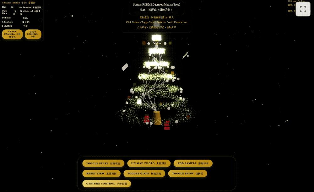 其次是,打造“豪华互动圣诞树”高保真3D网页应用,并要求视觉效果奢华,MiMo的生成结果能切换圣诞树和混沌状态,支持手势交互等。