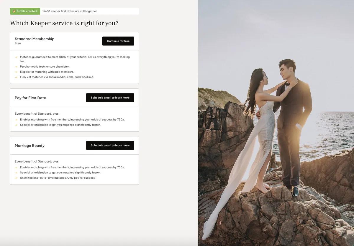 而这样的模式,造就了Keeper截然不同的商业模式。Keeper的“5万美元赏金计划”,其实不是传统意义上的高价会员费,而是把它当成一个封顶的成功费用。前期以单次匹配或线下约会的形式收取服务费,后续如果这段关系真的走到他们定义的“终点”,比如共同养育一个孩子、18个月保持稳定关系、领取结婚证明等,才需要缴纳5万美金。