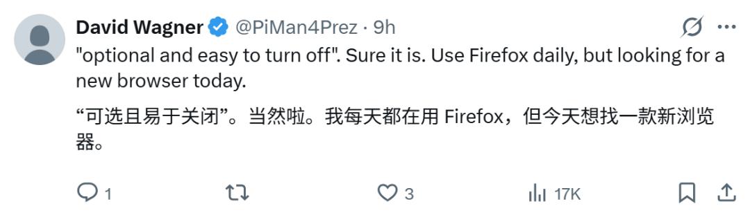 在 X、Reddit 等平台,大量用户的反对理由高度一致:他们并不是担心 AI 无法关闭,而是不希望 Firefox 走上这条路:
