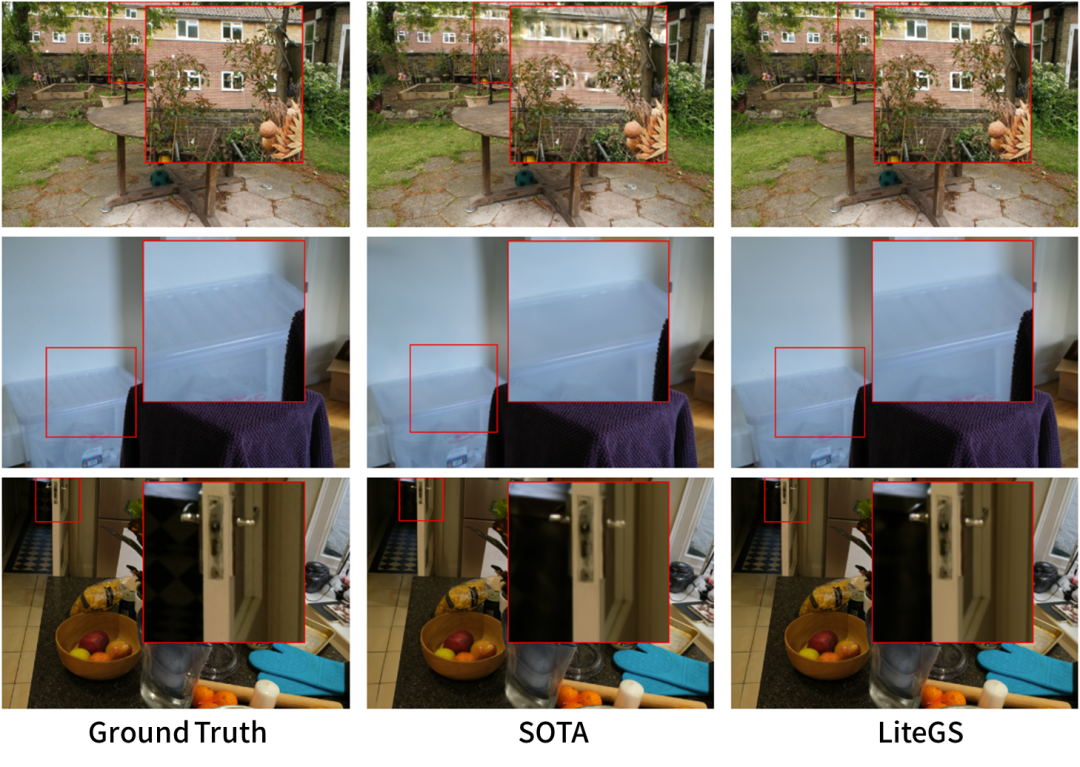 在相同参数量下,LiteGS在PSNR指标上超出主流方案0.2-0.4 dB,训练时间缩短3.8至7倍。