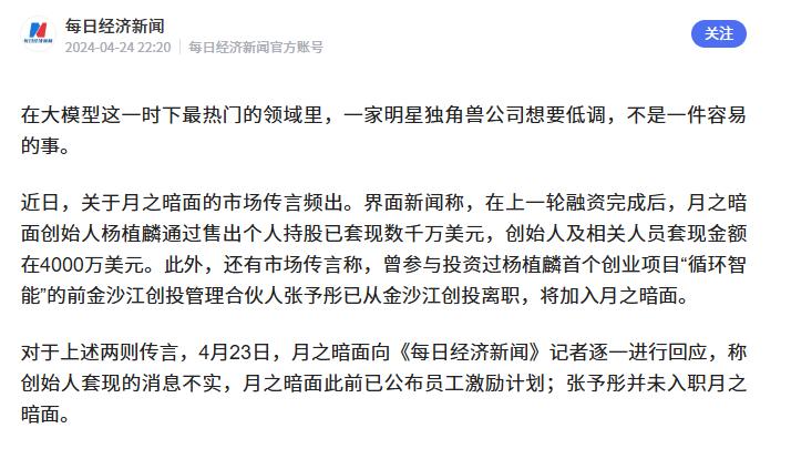2024年4月,界面新闻称,月之暗面创始人杨植麟通过售出个人持股已套现数千万美元,创始人及相关人员套现金额在4000万美元。此外,还有市场传言称,曾参与投资过杨植麟首个创业项目“循环智能”的前金沙江创投管理合伙人张予彤已从金沙江创投离职,将加入月之暗面。