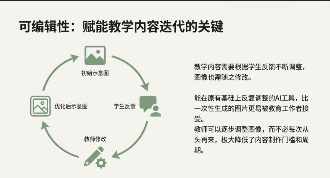 在这一过程中,可编辑性变得尤为重要。教学内容往往需要根据学生反馈进行调整,图像也需要随之修改。相比一次性生成的图片,能够在原有基础上反复调整的 AI 工具,更容易被教育工作者接受。