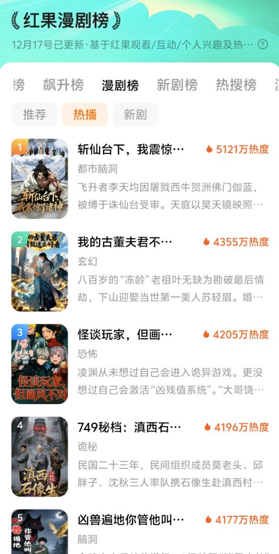 “红果漫剧榜”近期热播前二分别是《斩仙台下,我震惊了诸神!》与《我的古董夫君不可能这么好看》,两部作品相当具有代表性,前者是典型的男频题材,后者则是典型的女频题材。