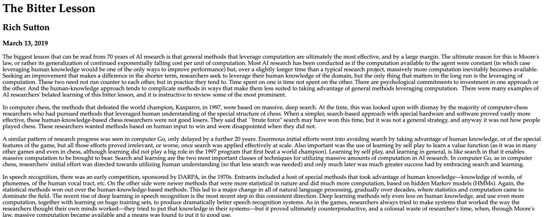 这被称为「苦涩的教训」(The Bitter Lesson):在算力面前,人类的精巧设计往往不值一提。