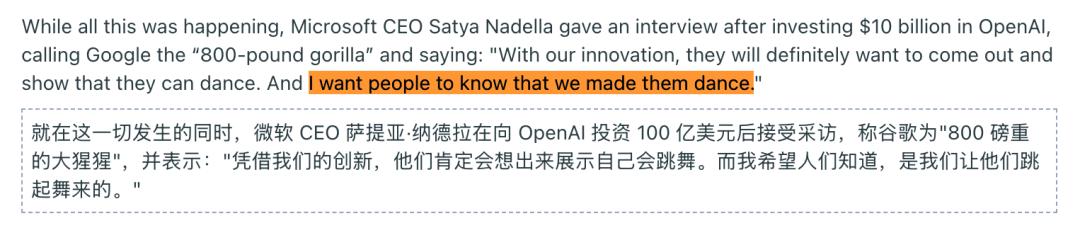 纳德拉在接受采访时,说出了一句杀人诛心的话:「我们要让人们知道,是我们让他们(谷歌)跳舞。」