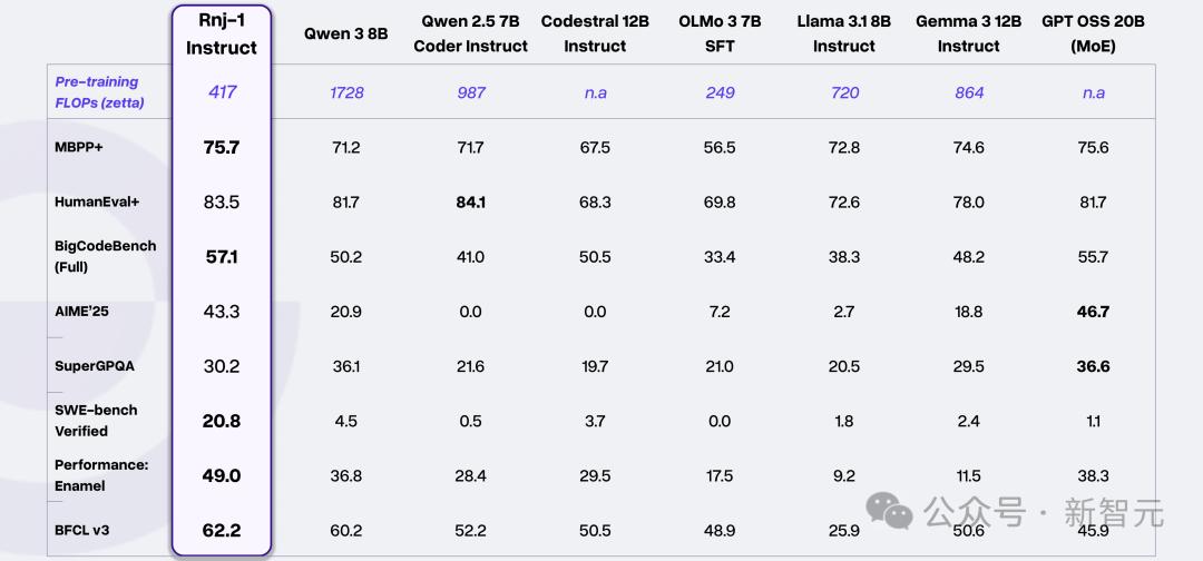 例如在Enamel这一考察高效算法实现的任务中,Rnj-1 Instruct 超过了强力基线。