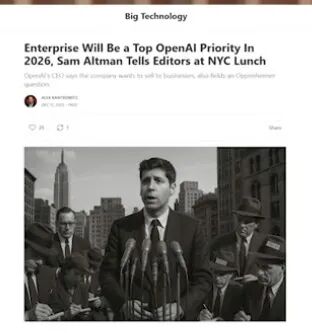 Alex Kantrowitz:你刚才提到了企业业务,我们聊聊 Enterprise。上周你在纽约跟一些新闻公司的编辑和 CEO 吃午饭时说,企业业务会是 OpenAI 明年的一个重大优先事项。我想听你展开讲讲:为什么这会成为优先级?你觉得你们和 Anthropic 相比处在什么位置?很多人会说这像是 OpenAI 的一次转向,因为你们一直更偏消费者业务。请你整体概述一下你们的企业计划。