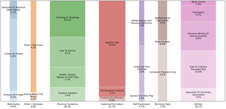 普通用户很少需要一台「竞赛级大脑」,他们更多需要一个「日常好用的助手」。OpenAI 对 150 万次对话的大规模分析佐证了这一判断,用户的核心需求极其接地气:实用指导(29%)、信息查询(24%)以及写作(24%)等,而与编程任务相关的对话只有 4.2%。