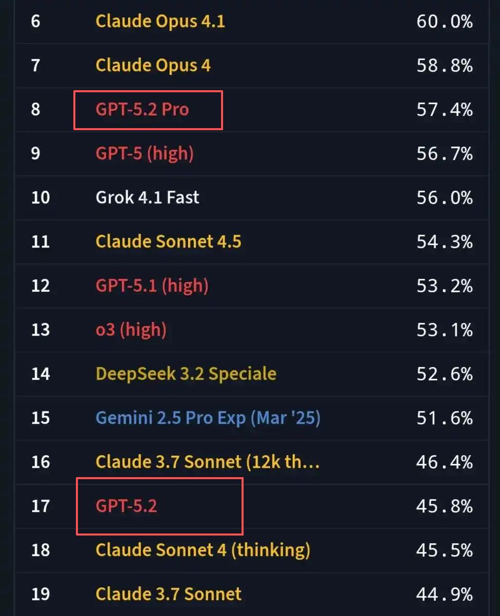 两家巨头明显带有“赶工”色彩的发布节奏,引发了另一波更为直接的市场反馈——大量用户的差评开始出现。有网友晒出GPT-5.2在SimpleBench上的“成绩单”,GPT-5.2的得分低于Claude Sonnet 3.7,后者是一个差不多一年前发布的模型;GPT-5.2 Pro的表现也没好多少,勉强超过GPT-5。