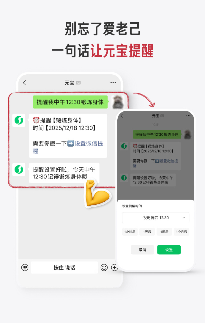 IT之家 12 月 19 日消息,今日,腾讯元宝宣布上线新能力,支持一句话在微信内设置提醒。用户只需向元宝发送一句包含事项和时间的消息,元宝即可自动识别任务内容,并在指定时间通过微信服务通知进行提醒。