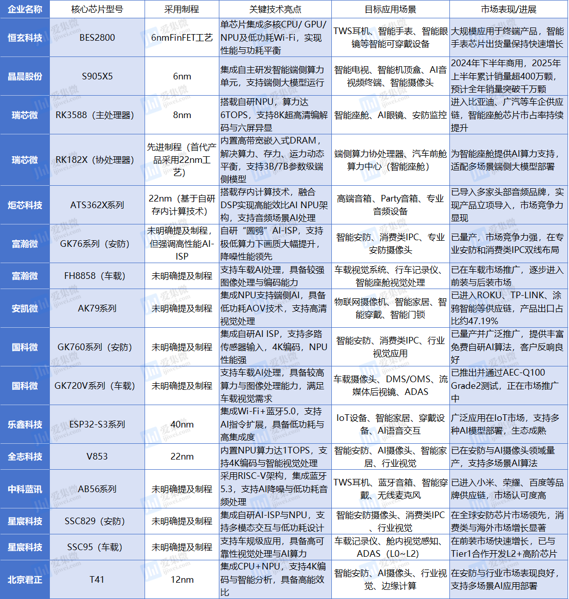 A股端侧AI芯片公司部分旗舰SoC应用全景表