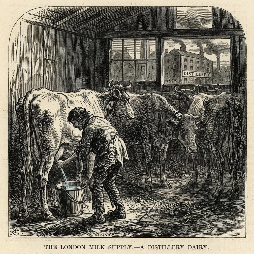 在 1858 年的纽约,发生过一起骇人听闻的「泔水奶丑闻(Swill Milk Scandal)」。当时的奸商为了降低成本,把奶牛关在酿酒厂旁边,喂它们吃滚烫的酒糟废料。这些病牛产出的奶是淡蓝色的,充满了细菌。