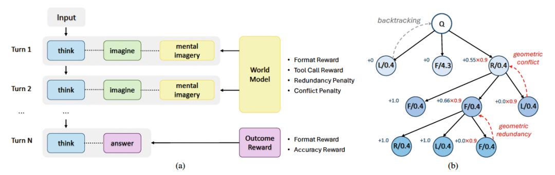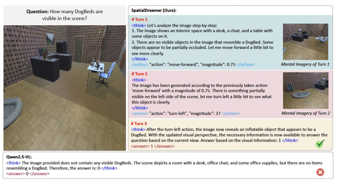 该过程使模型从「被动观察」转向「主动目标导向的想象」,实现了在内部三维环境中自主决定「去哪看、看什么、如何推理」。