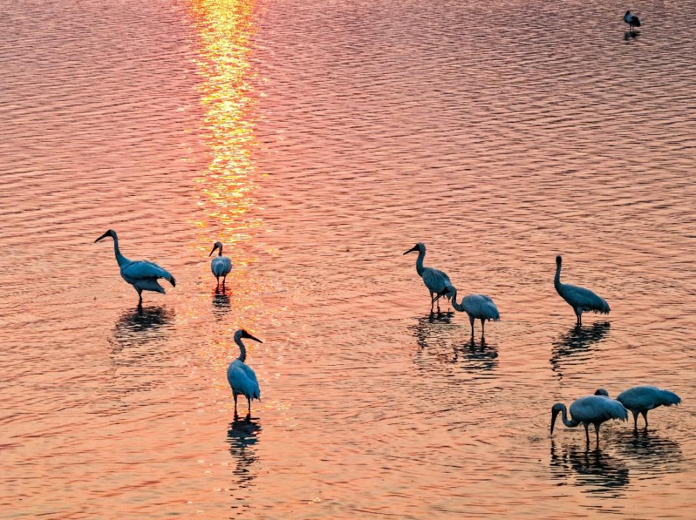 图:夕阳下,在鄱阳湖觅食休憩的白鹤群
