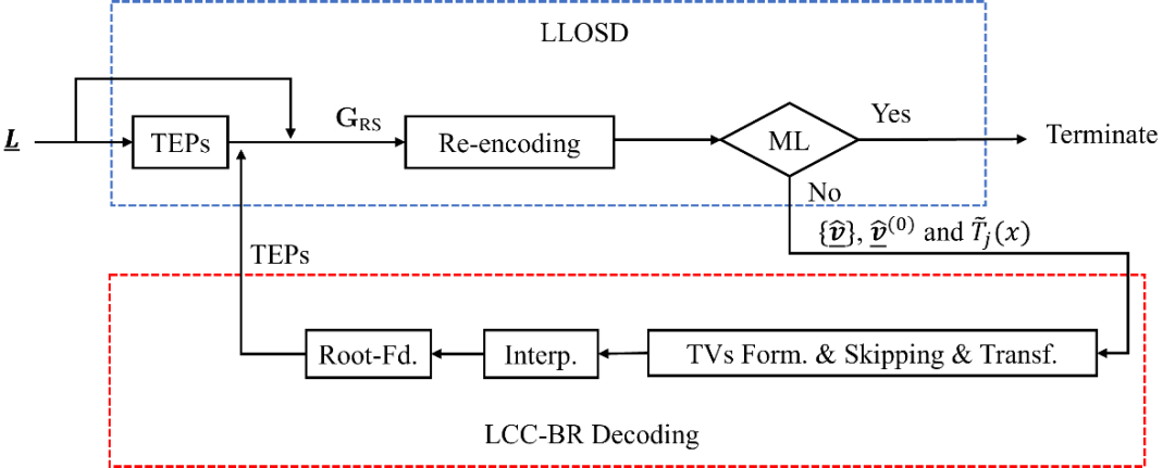 OSD译码是一种针对线性分组码的通用译码器。它通过对接收符号中的最可靠的独立位置进行有限翻转形成测试信息向量,进行重编码得到一系列的候选码字,从而选出似然度最高的码字作为译码输出。当翻转阶数足够大时,OSD译码可以逼近ML译码。其中,重编码所需的系统型生成矩阵需通过高斯消元计算获得,产生了难以克服的时延瓶颈。针对此难题,陈立教授团队另辟蹊径,巧妙地利用BCH码是Reed-Solomon (RS) 码的二元子码这一特性,提出了通过RS码的系统型生成矩阵来产生BCH候选码字的新方法。RS码的系统型生成矩阵能够通过拉格朗日插值多项式全并行生成,使译码不再依赖高斯消元计算,彻底消除了时延瓶颈。这种全新的OSD译码算法称为低时延OSD(LLOSD)译码。