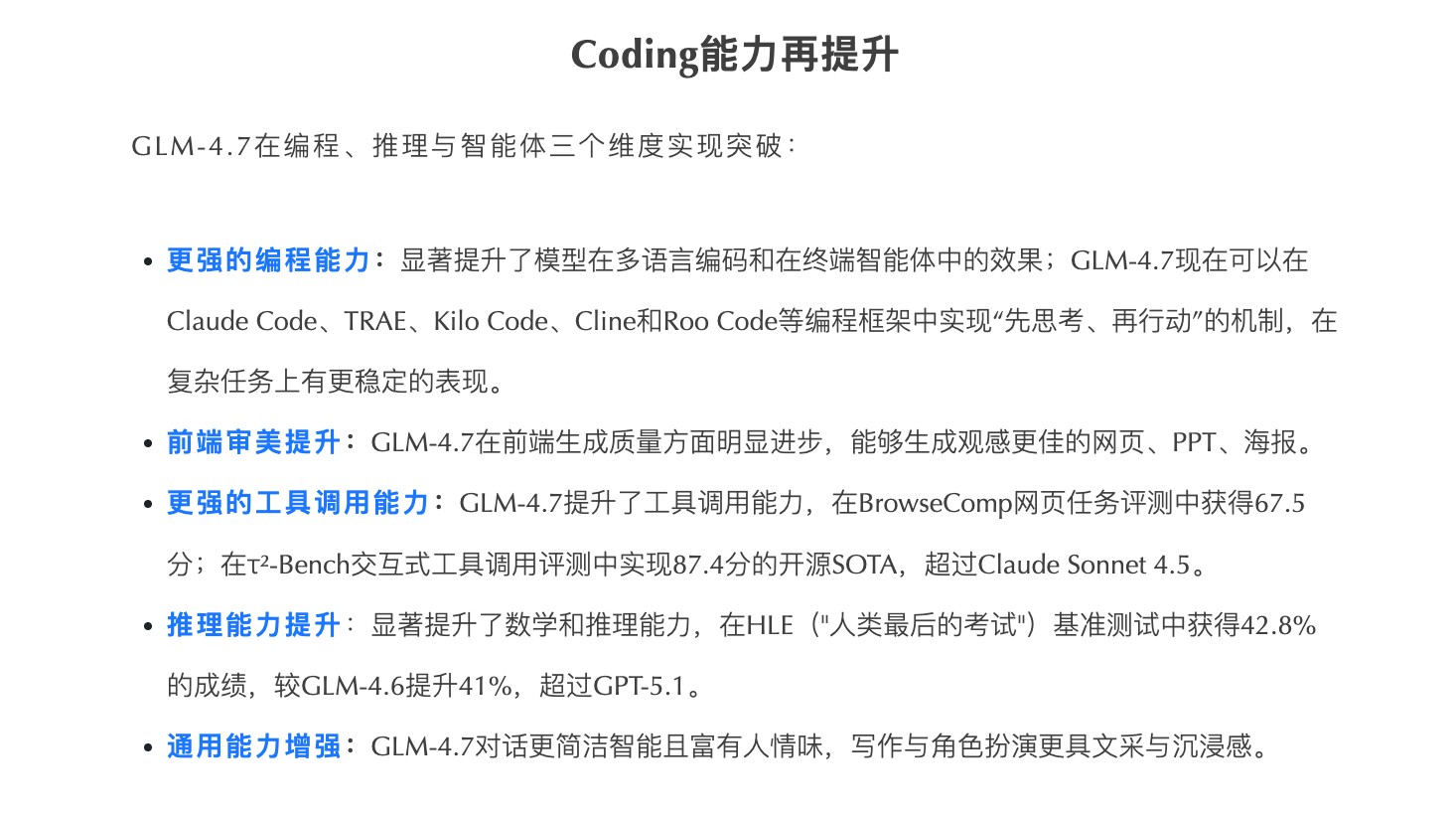 除编码能力外,GLM-4.7在长程任务中支持保留式思考机制以优化性能,并在前端代码与文档生成方面提升了视觉美观度,例如PPT的16:9适配率有所提高。模型目前已通过BigModel.cn提供API服务。