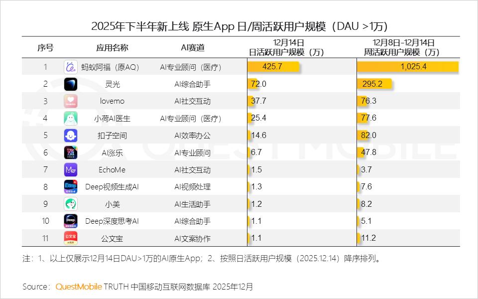 QuestMobile数据显示,蚂蚁阿福App、灵光App周(12.08-12.14)活跃用户规模分别达1025.4万和295.2万,位列下半年新上线原生App第一、第二;此外,另一医疗领域垂直应用,抖音旗下小荷AI医生App也有不错表现。