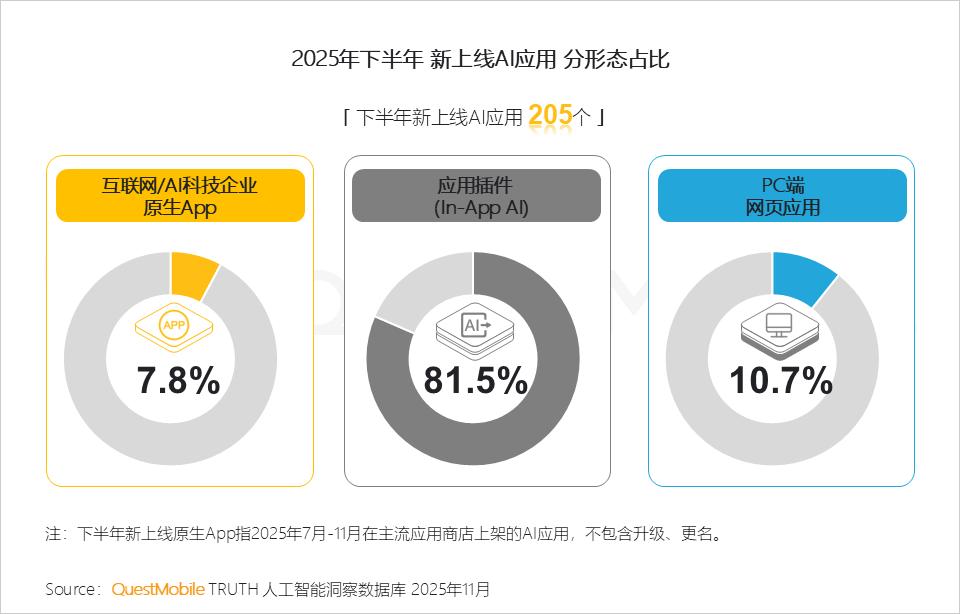 QuestMobile数据显示,下半年新上线AI应用共205个,其中,占比达81.5%,PC端网页应用占比10.7%,原生App占比7.8%。