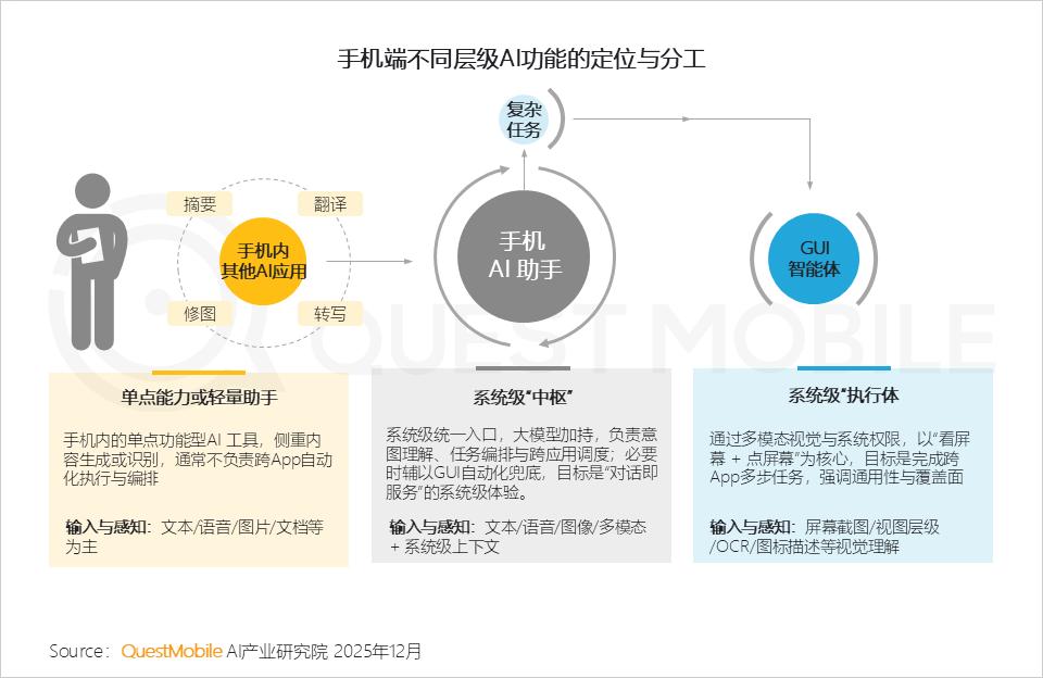 2、 GUI智能体负责“落地执行”,与手机AI助手、工具类AI应用,共同实现从“用户说需求”到“手机自动完成任务”的完整链路